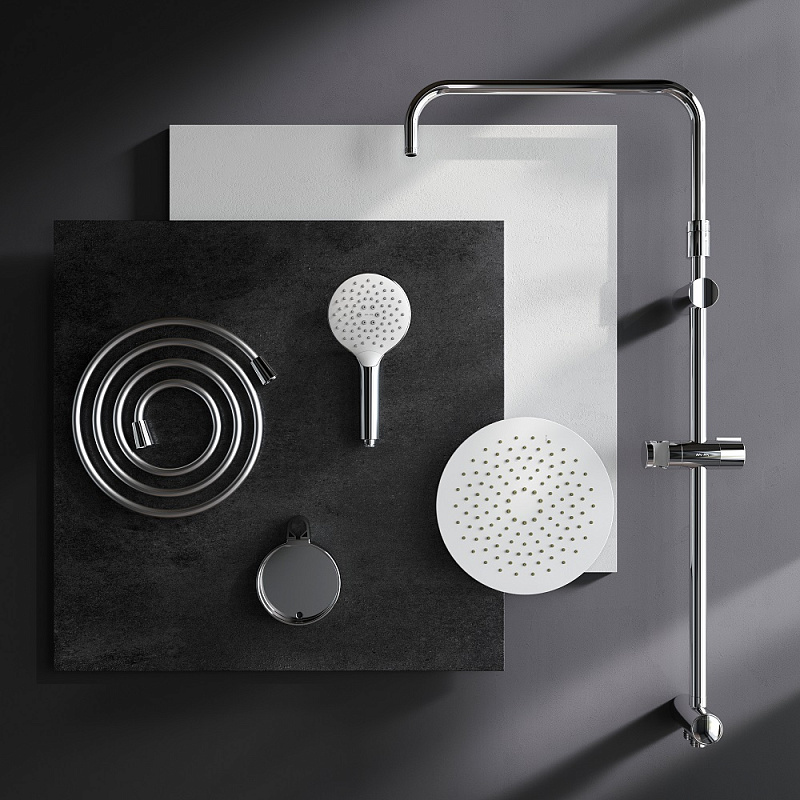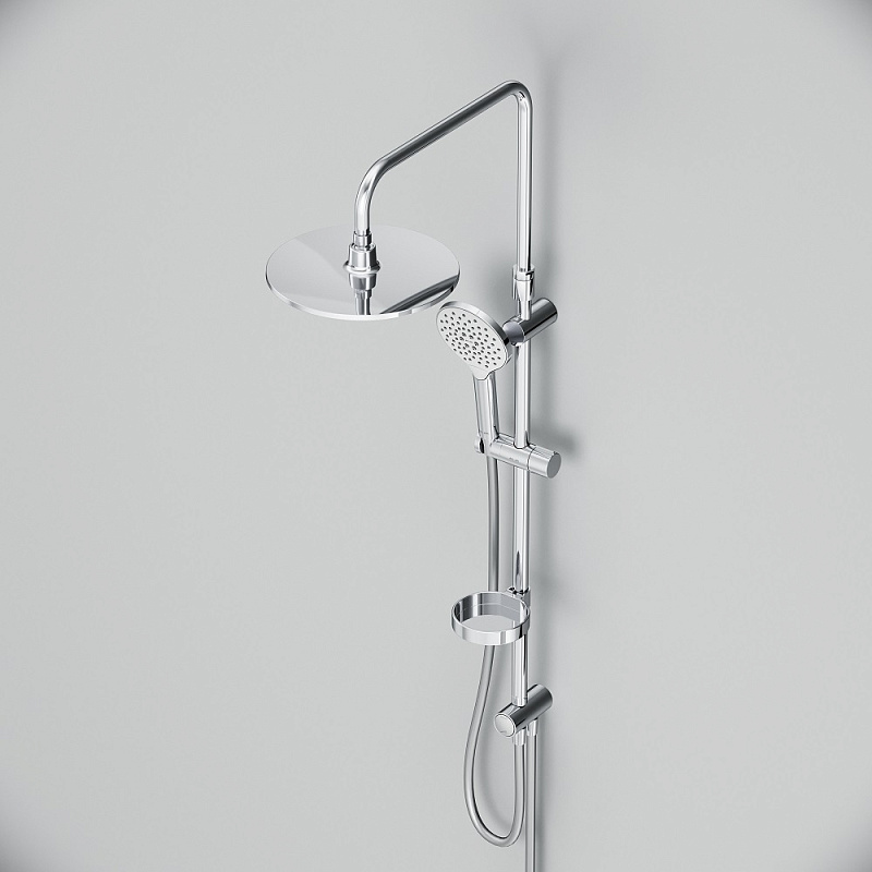 В комплектацию душевой системы входят: тропический душ, ручной душ, полочка, держатели штанги и душа. Длина душевой штанги - 1030-1460 мм. Длина душевого шланга - 1750 мм. Размер ручного душа - 120 мм. Диаметр верхнего душа - 254 мм.