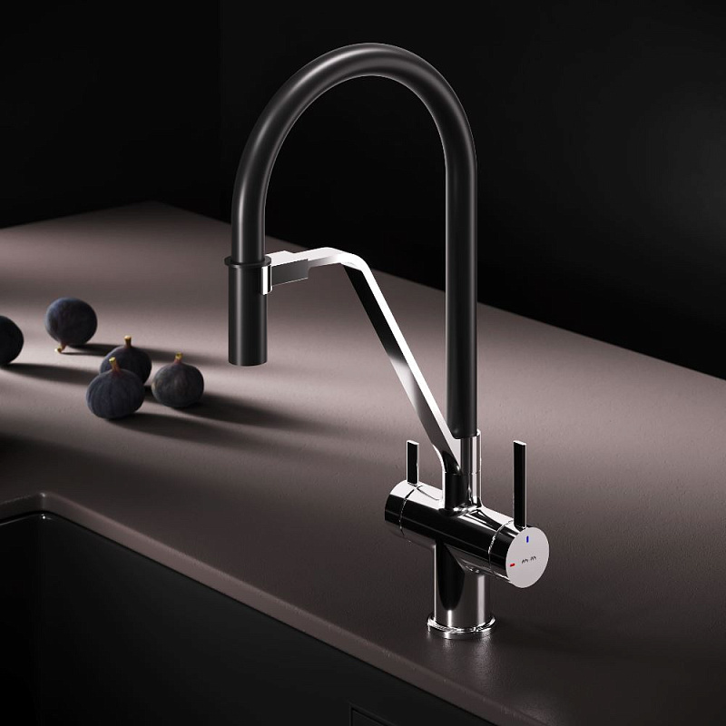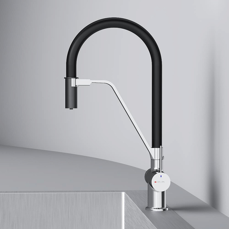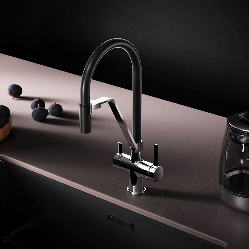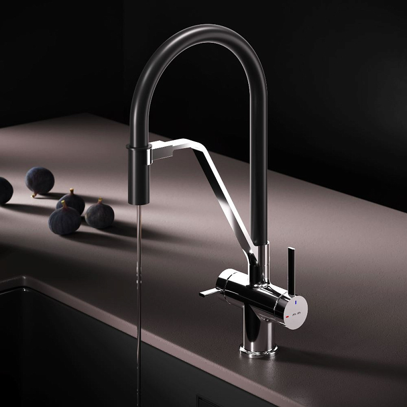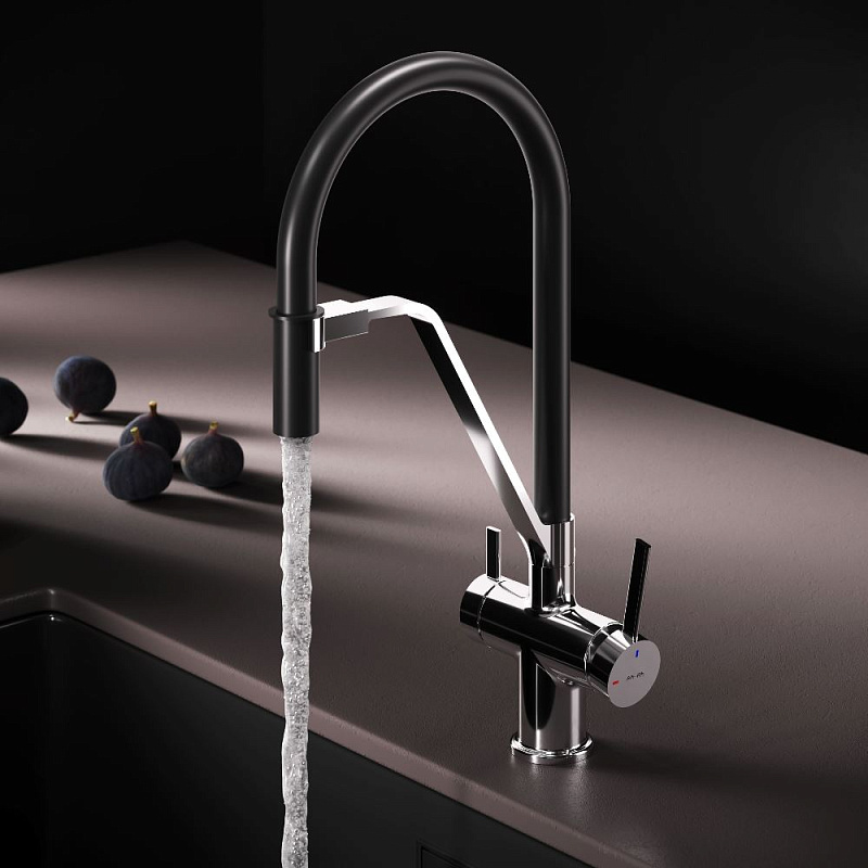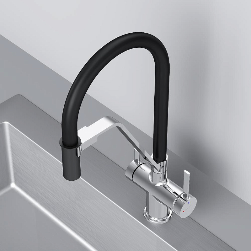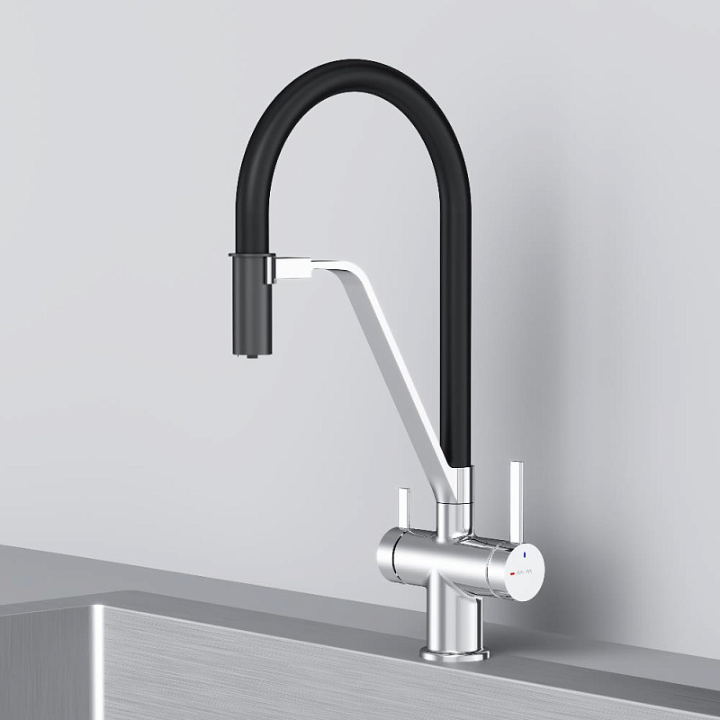 Смесители Смеситель для кухни AM.PM Func F8F07802 высокий, хром, с каналом для питьевой воды и гибким черным изливом купить в Москве.