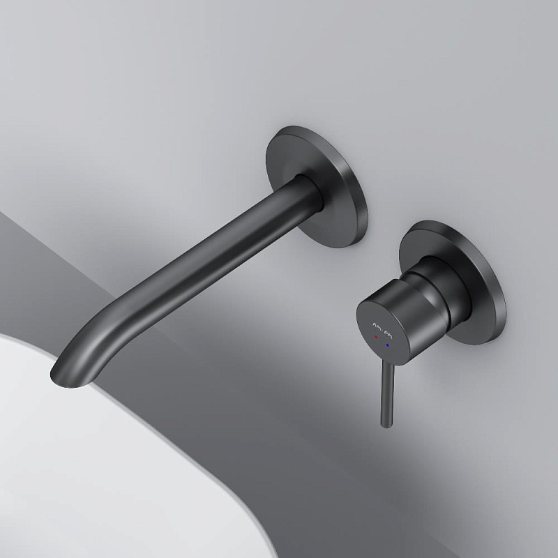 Выверенный изгиб в сочетании с чистой горизонталью излива подчёркивает архитектурную чистоту формы. Такое решение требует высокой точности производства и формирует цельный, визуально безупречный силуэт. А монтируемая в стену конструкция – это ответ на меняющиеся потребности клиентов, которые ищут простые и стильные решения для ванной комнаты. Размер ручек (Ш/Г/В): 49x49x62,8 мм. Размер излива (Ш/Г/В): 190x222x116 мм. Материал - латунь. Цвет - черный.