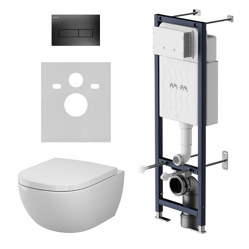 Готовый комплект к установке: система инсталляции для подвесного унитаза AM.PM Above IS110338.9X1900 с мехенической черной клавишей, подвесной унитаз AM.PM Above C9X1900SC.
